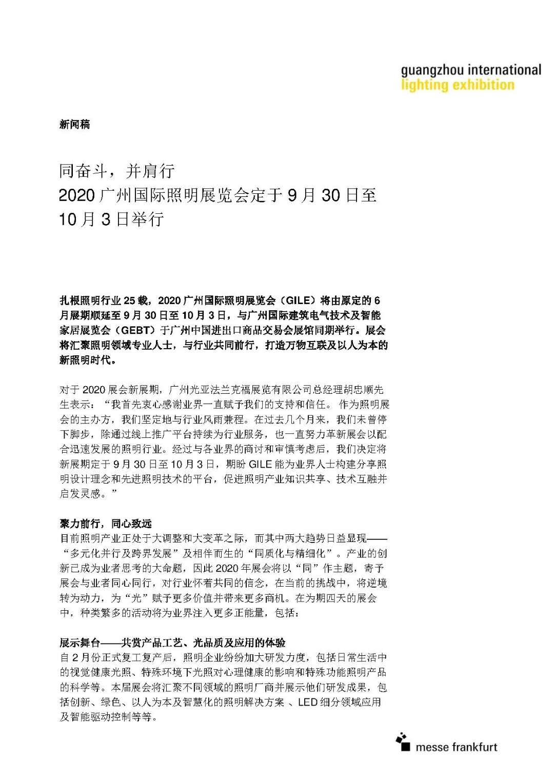 5月19日,广州国际照明展览会微信公众号发布消息,2020广州国际照明展览会(GILE)将由原定的6月展期顺延至9月30日至10月3日,